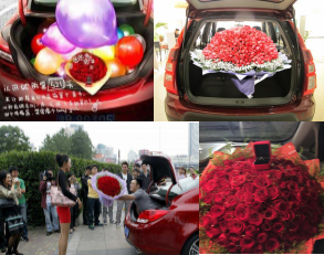 没错儿,你看到的是车子后备箱塞满的玫瑰鲜花和万花丛中的那枚戒指。