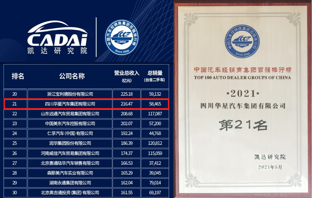 本次大会上,凯达研究院发布了“2021中国汽车经销商集团百强排行榜”,百强排行榜自2009年开始,已经发布13期,它不仅展示了中国汽车流通行业的发展成果,也通过对标分析提升了经销商集团的综合竞争力和行业知名度。本次百强榜单中华星汽车集团奋进至全国第21名,连续七年蝉联四川省第1位。